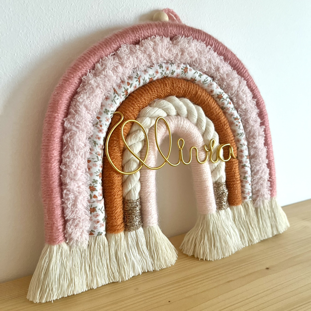 Arc-en-ciel en macramé avec biais en coton à personnaliser avec prénom en fil aluminium