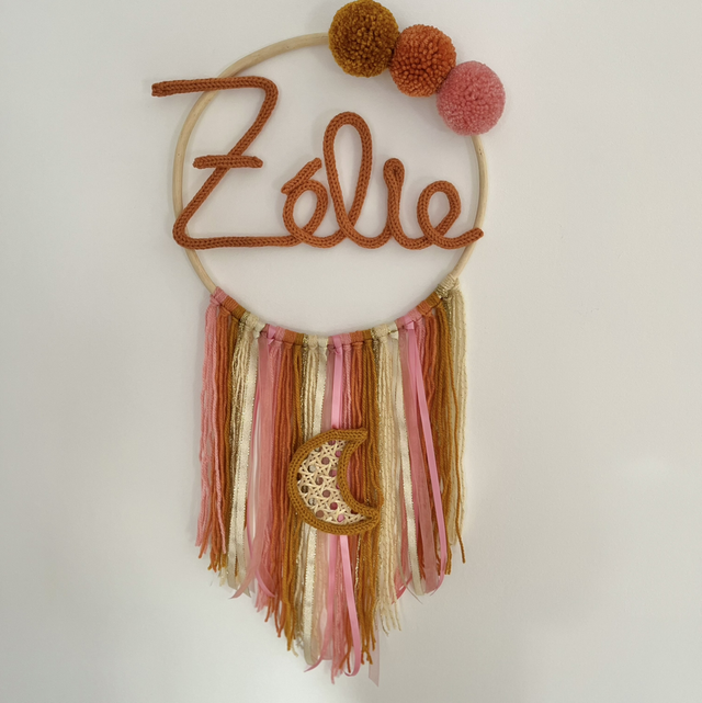 Un attrape rêve personnalisable avec prénom en tricotin et ajout de cannage possible.
