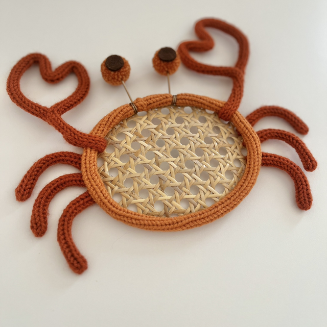 Craquez pour ce petit crabe plein de caractère ! Confectionné à la main en tricotin et cannage, il est rehaussé d’un détail en fil aluminium et d’adorables yeux réalisés en pompon et feutrine. Une décoration à la fois ludique et raffinée, idéale pour une chambre d’enfant, une ambiance bord de mer ou simplement pour ajouter une note joyeuse et artisanale à votre intérieur. Les couleurs peuvent être personnalisées selon vos envies : vous pouvez vous référer au nuancier pour choisir celles qui vous plaisent le plus.
