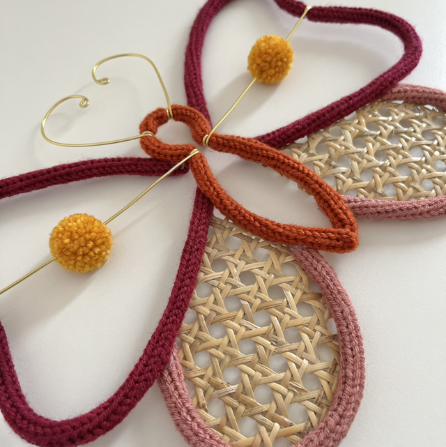 Une belle décoration murale en tricotin en forme de papillon, avec fil aluminium, pompon et cannage.