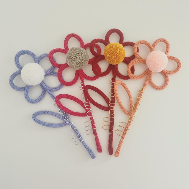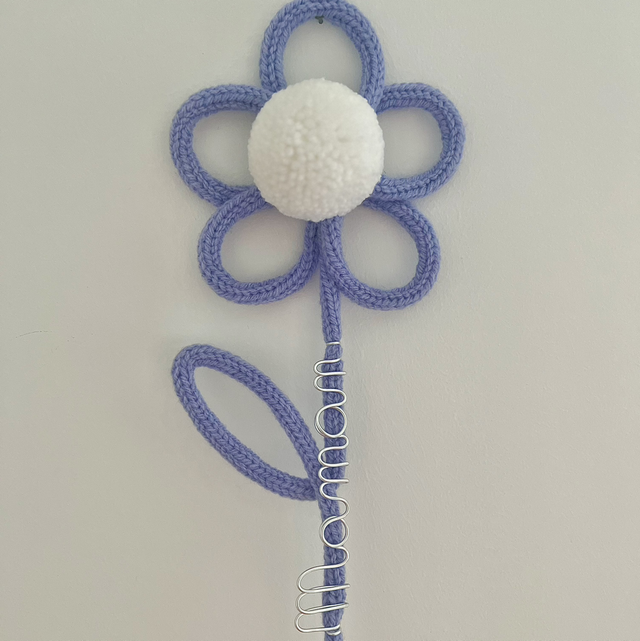 Une fleur en tricotin « maman » avec son pompon qui ne fanera jamais. A mettre dans un vase ou à utiliser en décoration murale. La fleur mesure 30 cm de haut et 13 cm de large.