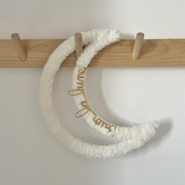 Une touche de douceur dans la chambre de votre enfant avec cette décoration murale en forme de lune toute douce. Vous pouvez opter pour une lune seule, avec "Sur la lune" ou les mots de votre choix en fil aluminium.