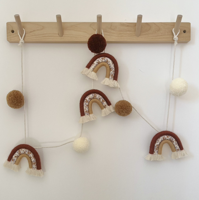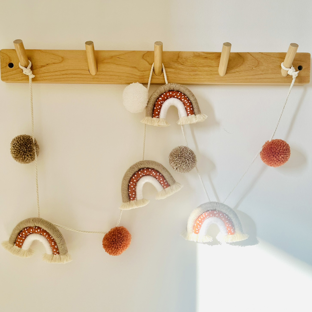 - Guirlande 120 cm avec 4 arcs-en-ciel en macramé avec biais de coton et 5 pompons. Option led possible.