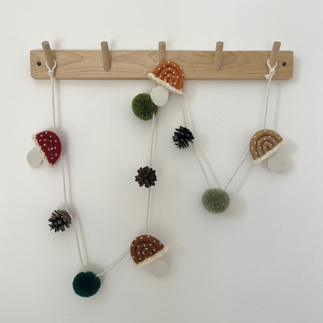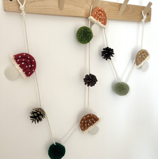 Cette guirlande unique mêle champignons en macramé, pompons faits main et véritables pommes de pin ramassées lors de mes promenades.
