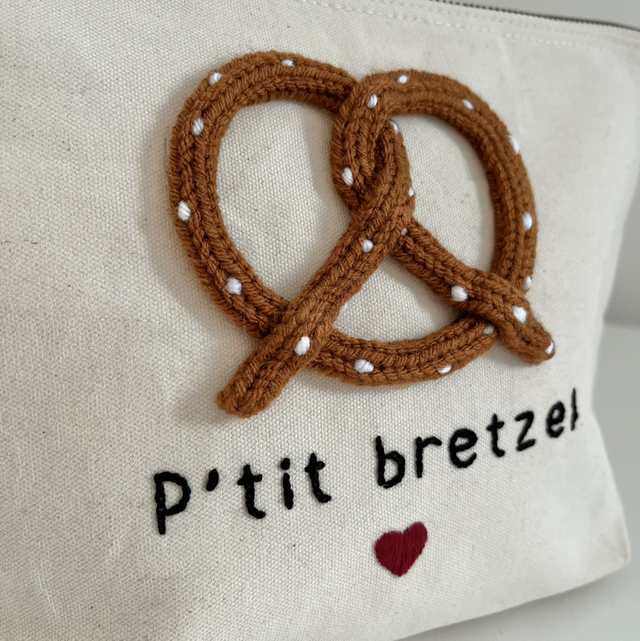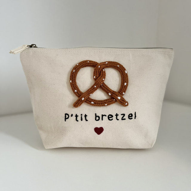 Découvrez cette jolie pochette en coton "à croquer" personnalisable, parfaite pour ajouter une touche d’originalité et de douceur à votre quotidien. Sur le devant, un bretzel en tricotin, accompagné du mot “P’tit bretzel” et d’un petit cœur brodés à la main, pour un effet à la fois raffiné et chaleureux.