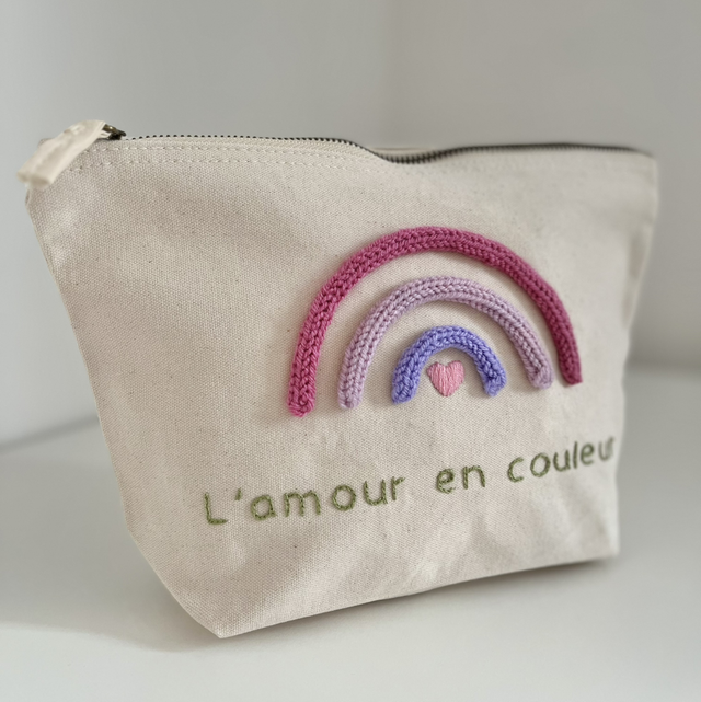 Laissez-vous séduire par cette pochette en coton "arc-en-ciel de tendresse" personnalisable, où l’amour prend forme à travers des broderies colorées.