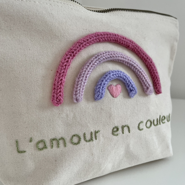 Pochette coton « arc-en-ciel de tendresse » en broderie et tricotin à personnaliser