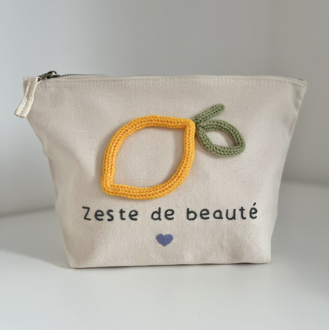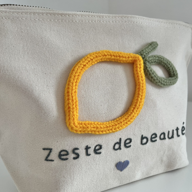 Avec son petit citron en tricotin et sa broderie faite main délicate, la pochette Zeste apporte une touche de fraîcheur et de bonne humeur à votre quotidien.